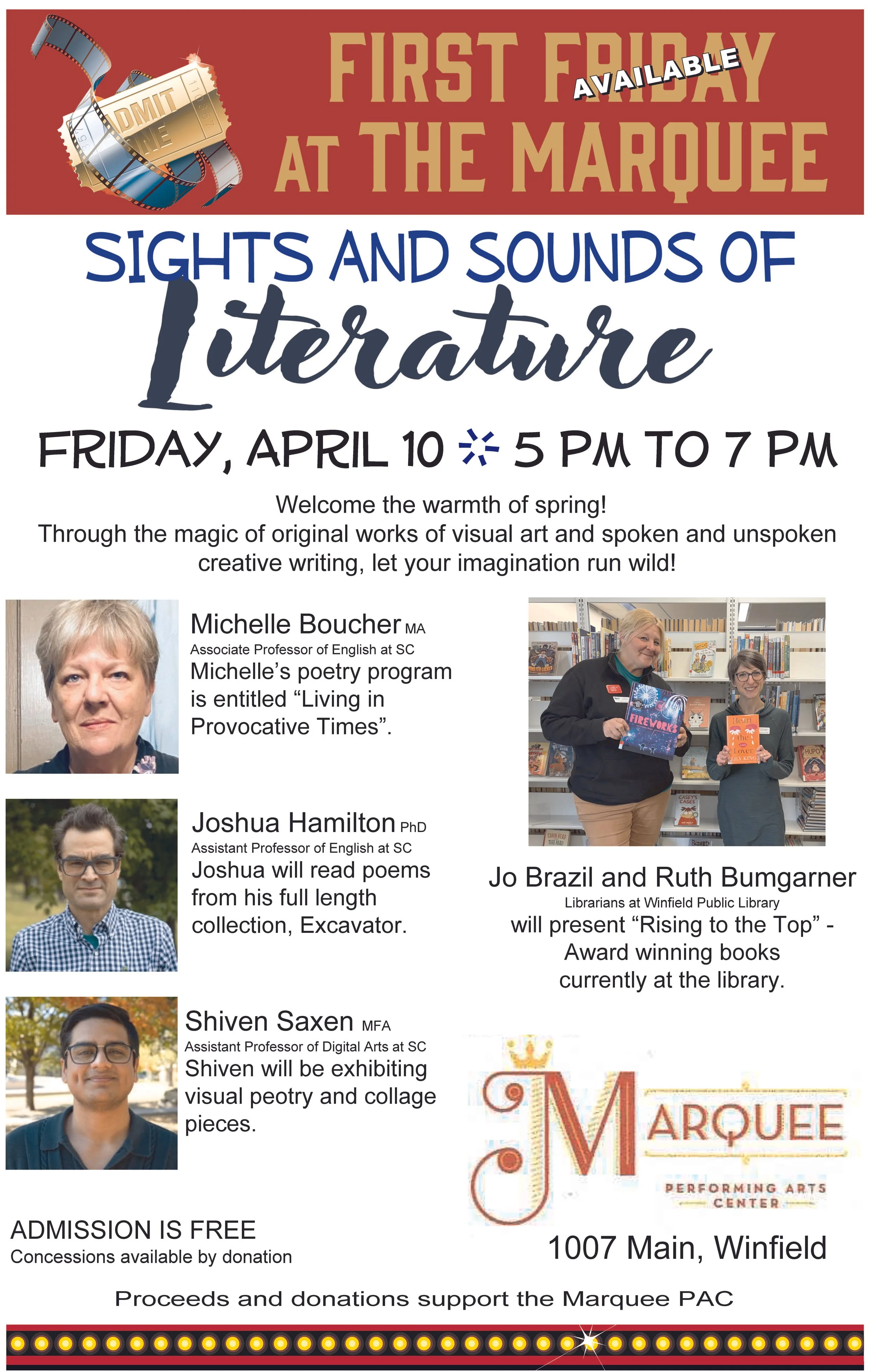 Scroll Down for Latest Information About the Marquee! Upcoming Events Featured Apr 9, 2026 2nd Thursday Luncheon Apr 9, 2026 Apr 9, 2026 Apr 10, 2026 First (available) Friday at the Marquee: Spring Literature and Art Jam Apr 10, 2026 Apr 10, 2026 Apr 25, 2026 4-H Shooting Sports Flower Sale Apr 25, 2026 Apr 25, 2026 May 1, 2026 First Friday at the Marquee: Yards and Gardens May 1, 2026 May 1, 2026 May 14, 2026 2nd Thursday Luncheon May 14, 2026 May 14, 2026 Jun 5, 2026 First Friday at the Marquee Jun 5, 2026 Jun 5, 2026 Jun 11, 2026 2nd Thursday Luncheon Jun 11, 2026 Jun 11, 2026 Jul 9, 2026 2nd Thursday Luncheon Jul 9, 2026 Jul 9, 2026 Jul 30, 2026 Booth at the Cowley County Fair Jul 30, 2026 Jul 30, 2026 Jul 31, 2026 Booth at the Cowley County Fair Jul 31, 2026 Jul 31, 2026 See Full Schedule