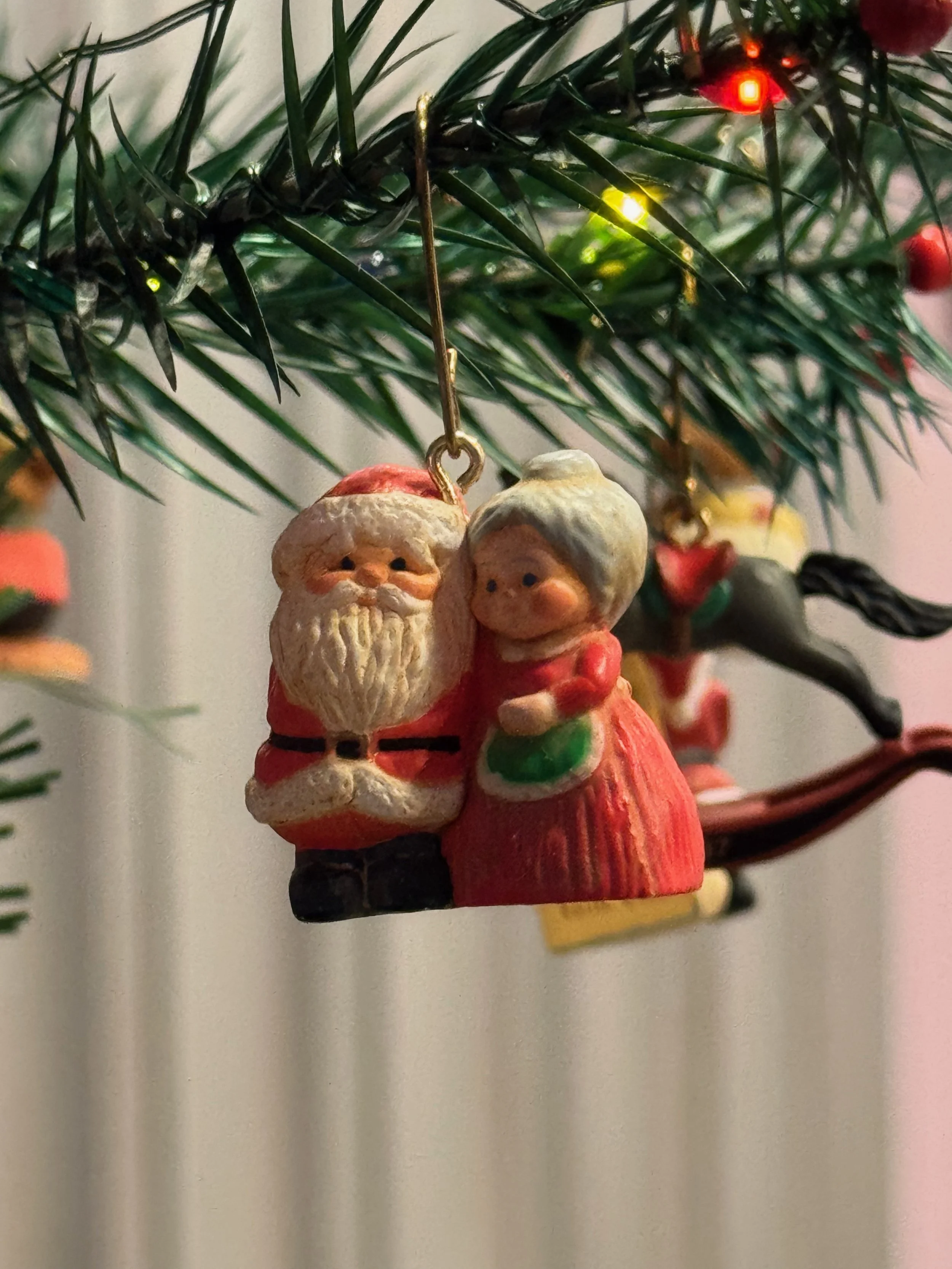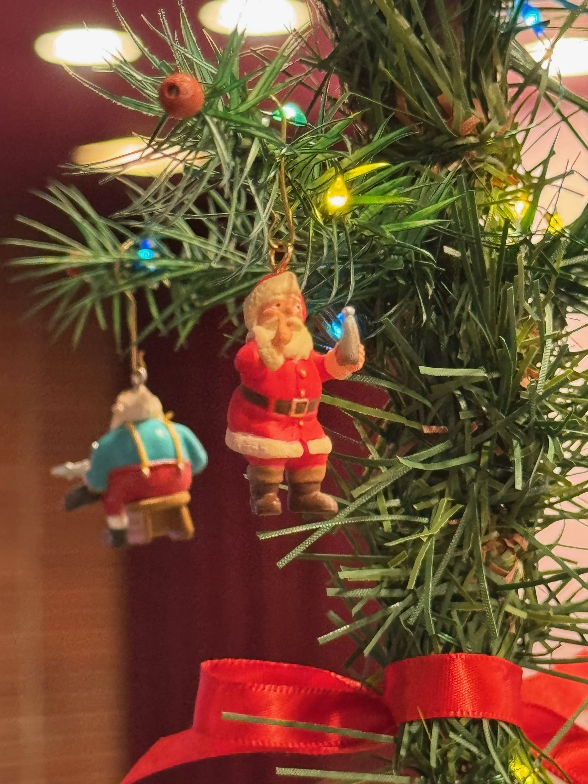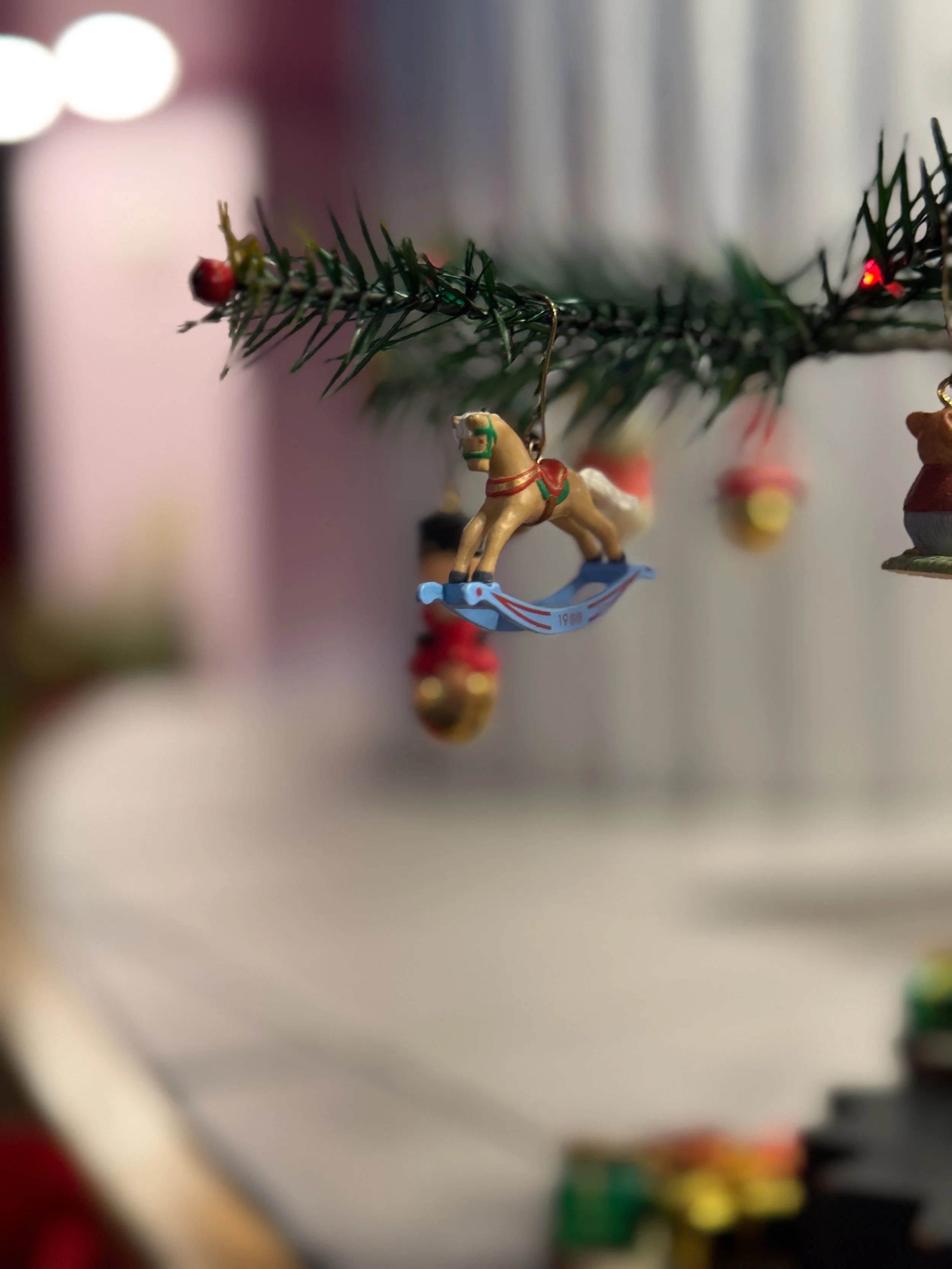 This charming miniature tree lives up to its name, celebrating the magic found in small, nostalgic holiday keepsakes. Each slim branch is adorned with tiny vintage-style ornaments, delicate rocking horses, jolly Santas, Mrs. Claus bells, and other lovingly detailed figurines that evoke classic Christmas memories. The sparse, old-fashioned tree design allows every ornament to shine, creating a delightful miniature world suspended in the air.