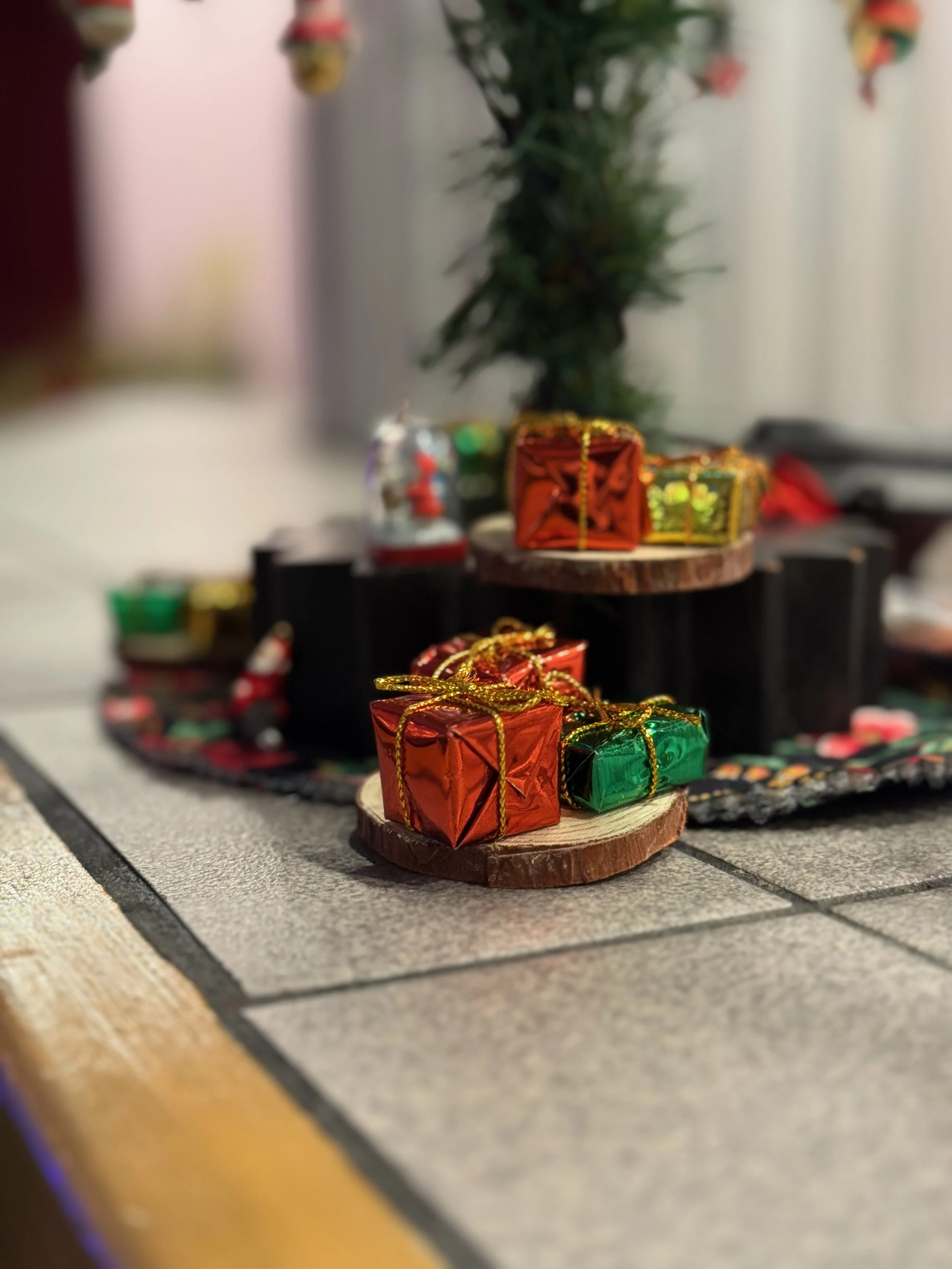 At the base, clusters of miniature wrapped gifts rest on wooden rounds, adding warmth and whimsy. Soft multicolored lights twinkle through the branches, highlighting the craftsmanship of each tiny treasure. Sweet, nostalgic, and full of character, this tree brings the charm of a bygone Christmas to life on a small but enchanting scale.